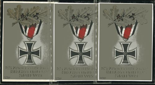 1940 ES KANN NUR EINER SIEGEN UND DAS SIND WIR. 3 Propagandakarten minimal verkleinert mit 3 verschiedene Sonderstempel vom "30.7.1940 Großdeutscher Reichstag" vom "3.9.1940 Wiesbaden Waffenstillstandskommission" und "12.1.41 Berlin Tag der Briefmarke", alle befördert.