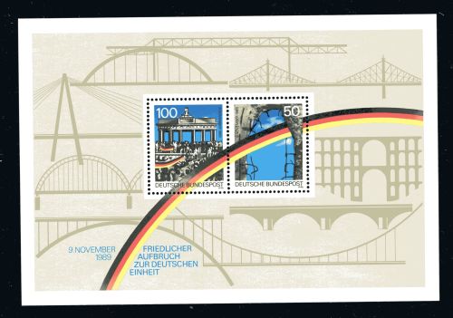 1990 Block 22 , Berliner Mauer mit Plattenfehler (roter Strich im unteren Ende des gelben Regenbogenstreifen), selten.