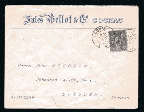 1897 Reklameumschlag "Jules Bellot & Co Cognac" mit Stempel nach Dresden.