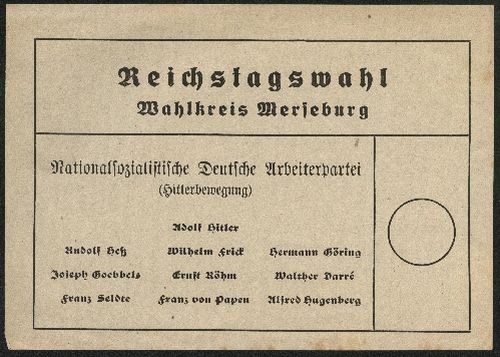 2 Belege Reichstagswahl Merseburg. Nationalsozialistische Deutsche Arbeiterpartei.