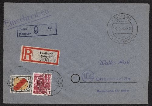 1948 Baden 18.4.48 R-Brief MeF ab Freiburg nach Dresden, mit TAXE - Stempel Gebühr bezahlt "9".