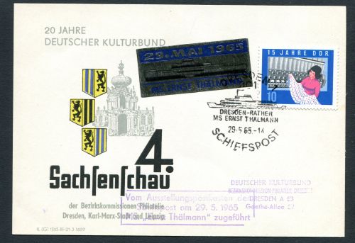1965 DDR 4. Sachsenschau mit Schiffspoststempel 29.5.65 MS Ernst Thälmann und Motiv - Schiffsaufkleber vom 29. Mai 1965