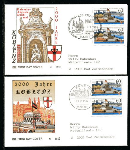 1992 Mi.Nr. 1583y , , FDC, mit je 2 Marken senkrechtes Paar 60 Pfennig Koblenz, mit Fluoreszenz auf 2 Sonderbriefe (Schmuck FDC) 2000 JAHRE KOBLENZ.