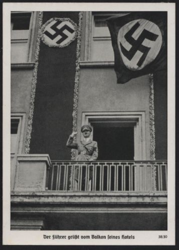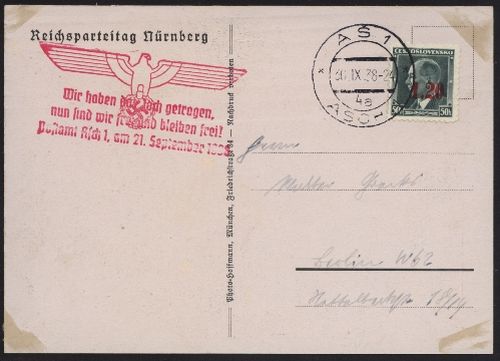 1938 Reichsparteitag Nürnberg Sonderkarte. Der Führer grüßt vom Balkon seines Hotels, mit Marke Tschechoslowakei 50H mit Aufdruck 1,20 und Stempel "AS 1 31.9.38 ASCH", nicht befördert, rs. 4 kleine Haftspuren von Fotoecken, Vorderseite in feiner Erhaltung.