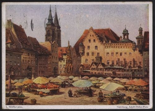 1942 Nürnberg Sonder-Farbkarte, Adolf-Hitler-Platz. Nach einen original Gemälde von "Ludwig Mößler, Rothenburg o.d. Tauber", mit 6 Pf. Hitler Marke und Stempel "Nürnberg 8.12.42 Die Stadt der Reichsparteitage" und Kastenstempel "EIGENE VORSICHT BESTER UNFALLSCHUTZ", echt befördert.