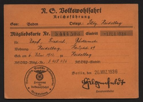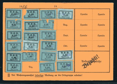 1936 NS Volkswohlfahrt, Mitgliedskarte Nr. 5444506, rs. mit Quittungsmarken Berlin 1936 bis 1938