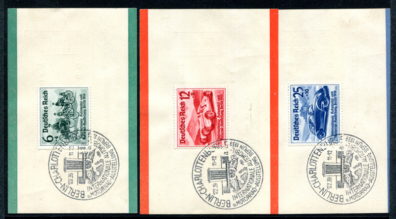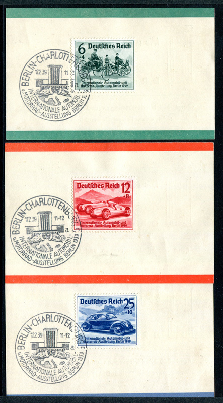1939 Mi.Nr. 686/68 /, Internationale Automobil- und Motorrad - Ausstellung, kompletter Satz auf Sonderblatt der Dresdener Bank mit Ersttags - Sonderstempel 17.2.1939