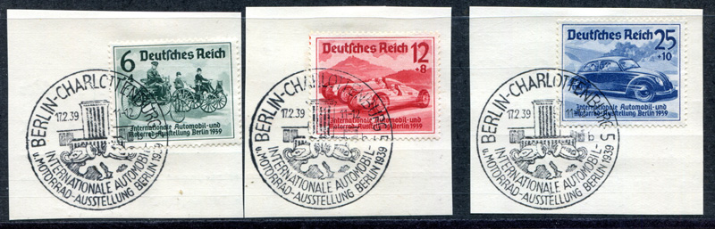 1939 Mi.Nr. 686/88 , . Internationale Automobil - Ausstellung, kompletter Satz auf ausgeschnittenes Sonderblatt der Dresdener Bank mit Ersttags - Sonderstempel 17.2.1939