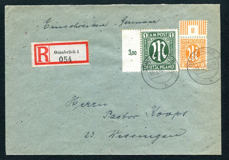 1945 Mi.Nr. 35 und 21 , , MiF, AM - Post Beleg mit 1 Mark mit Seitenrand links, mit Zusatzfrankatur 8 Pfennig mit Unterrand, auf R.-Brief ab Osnabrück 03.5.46 nach Wissingen mit Ankunftstempel 4.5.46. SCHLEGEL hat zur Zeit keinen Vergleichsstempel.