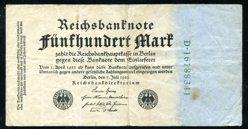 LIQUIDATIONSPOSTEN.1922 Reichsbanknote Fünfhundert Mark. Rosenberg Katalog Nr. 71, zwei mal gefaltet.