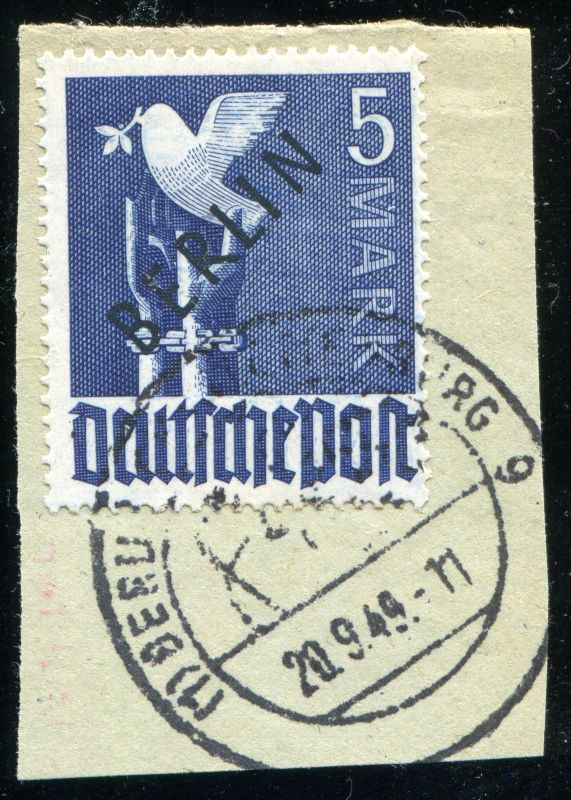 1948 Mi.Nr. 20 , 5 Mark Schwarzaufdruck auf Briefausschnitt, gestempelt Berlin 20.9.48. geprüft und signiert "Bühler". Mi.(750.--Euro)