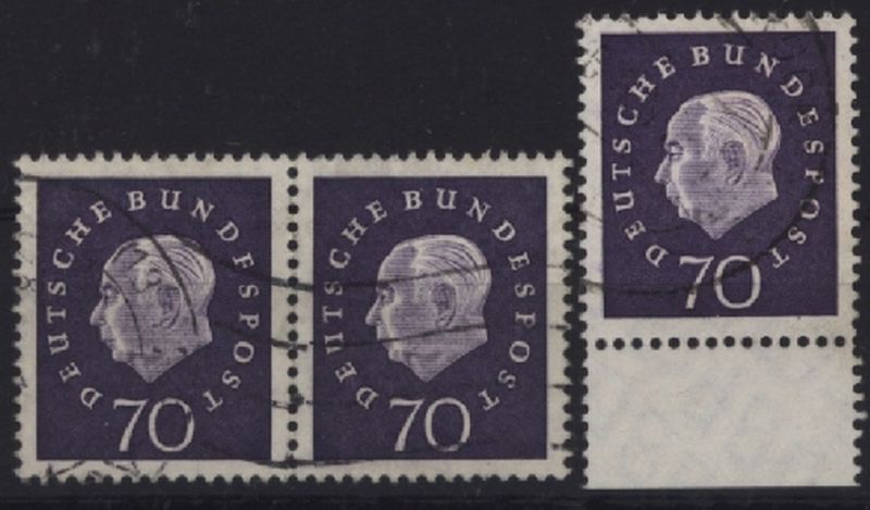 1959 Mi.Nr. 306 , , 70 Pfennig Heuss III, mit Rund- und Wellenstempel, sowie 1 Marke vom Unterrand, Rundstempel und in guter Zähnung. Mi.(500.--)Euro.