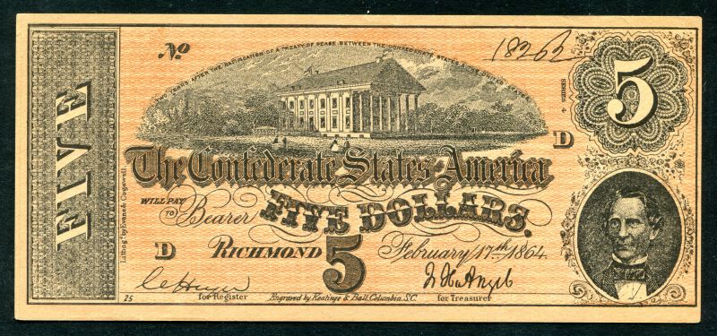 1864 USA 5 Dollars Geldschein (Eidgenossen), in bankfrischer Erhaltung.