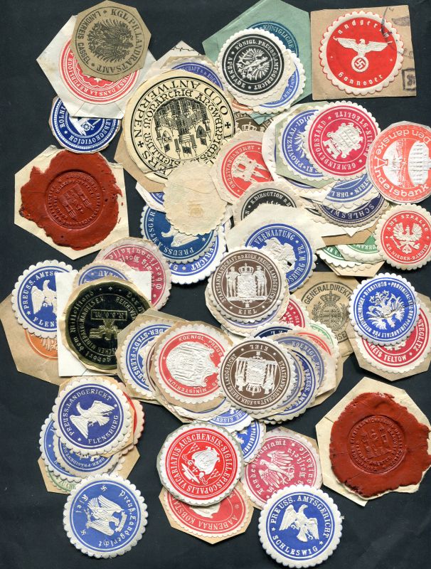 Prägesiegelmarken über 100 Stück meist aus Briefen augeschnitten, wohl aus den Kriegsjahren, von Städten, Behörden, usw., auch mit Hakenkreuz, in unterschiedlicher Erhaltung. Ein selten angebotener Posten.