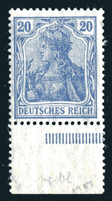 LIQUIDATIONSPOSTEN. 1915 Mi.Nr. 87 IIc , 20 Pfennig Germania, Platte, mit Unterrand, geprüft.