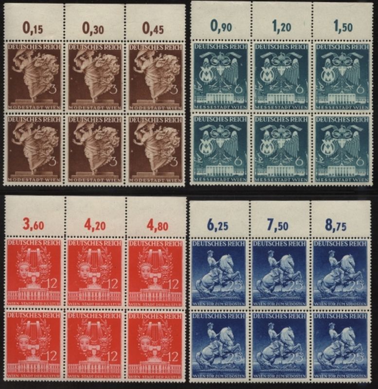 1941 Mi.Nr. 768/71 , im 6er Block mit Oberrand, Wiener Frühjahrsmesse, kompletter Satz, zum Teil Haftstellen von Farbe im Gummi. Mit Plattenfehler 769 f4 und 771 f15. Mi. zusammen ca.(250.--)Euro.