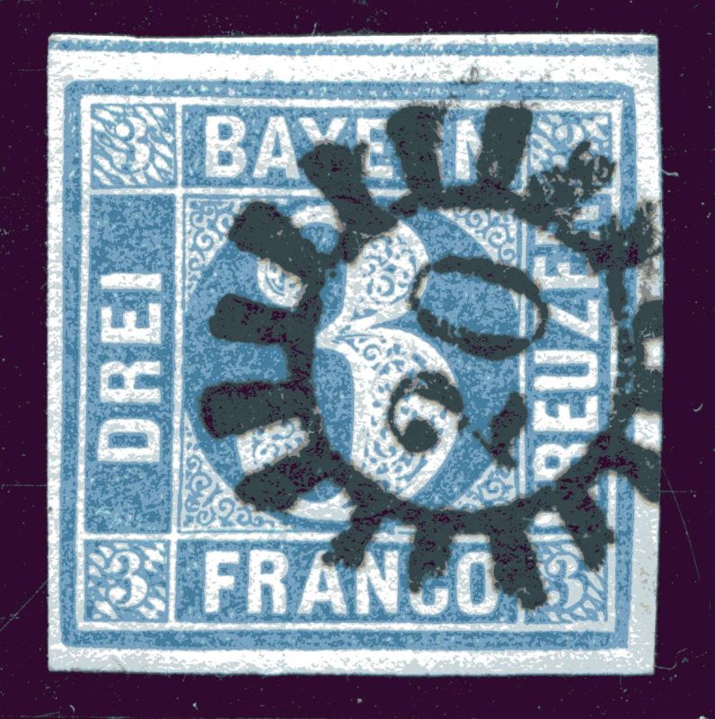LIQUIDATIONSPOSTEN. 1849 Mi.Nr. 2 , Bayern 3 Kr. in blau, mit rotem Seidenfaden, mit geschlossenem Mühlradstempel Nr. 20, breitrandig geschnitten.