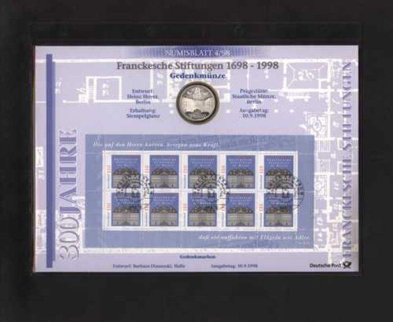 Numisblatt 1998/4 300 Jahre Franckesche Stiftungen, mit 10 DM Sondermünze und Bundesrepublik Kleinbogen Nr. 2011
