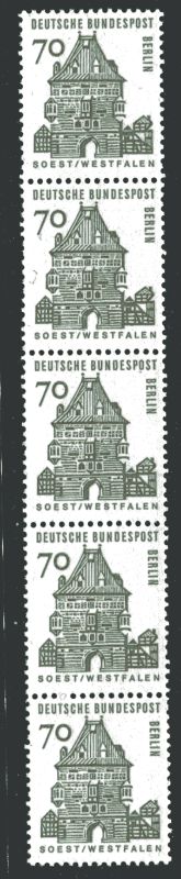 1964 Mi.Nr. 248R , 70 Pfennig Deutsche Bauwerke, im 5er Streifen mit rückseitiger Nr. (095)