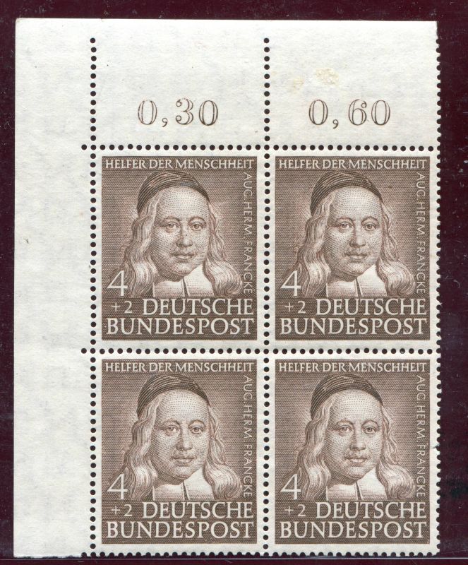 1953 Mi.Nr. 173 , , August Hermann Franke 4 2 Pfennig, im 4er Block, aus der Bogenecke oben links.