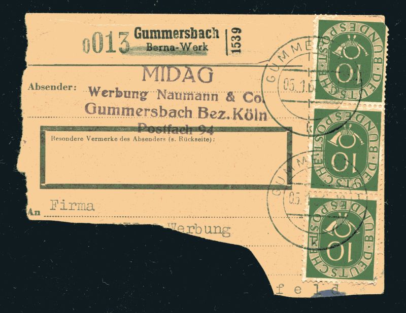 1951 Mi.Nr. 132 , 30 Pfennig Posthorn im waagerechtem 3er Streifen vom Unterrand, zusätzlich 2 mal 3er Streifen senkrecht 10 Pf. sauberer Rundstempel auf Paketkarte. Mi.(200.--)Euro.