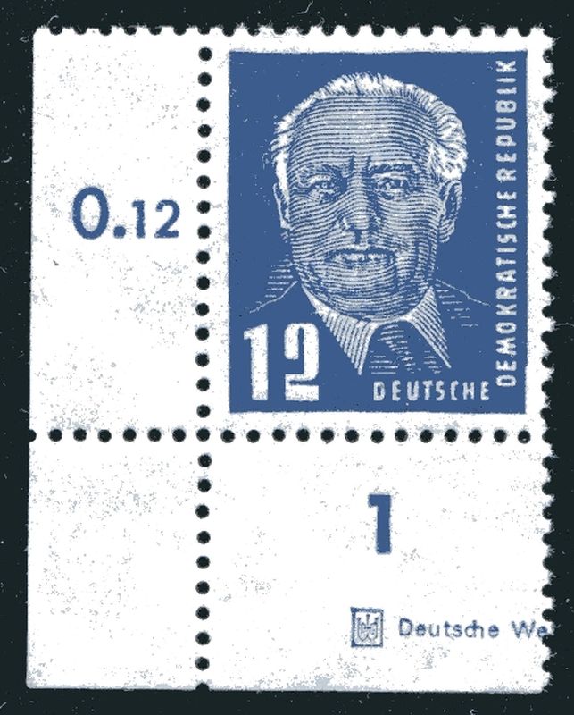1950 Mi.Nr. 251 , 12 Pfennig linke Bogenecke mit Druckerzeichen (DZ1). Rückseite am Bogenrand schwarze Haftstellen von schwarzer Steckseite, sonst Mi.(200.--)Euro.