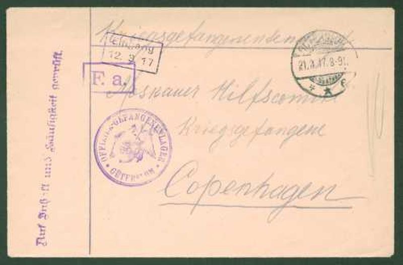 1917 Kriegsgefangenenbrief mit lila Stempel Gefangenenlager Gütersloh und Zensurstempel, Prüfstempel, Eingangstempel, nach Kopenhagen.