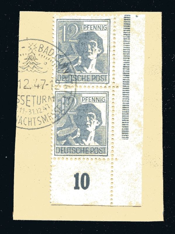 1947 Mi.Nr. 947 , 12 Pfennig Kontrollratsaugabe Bogenecke unten rechts aus Markenheftchenbogen unten durchgezähnt, mit Sonderstempel.