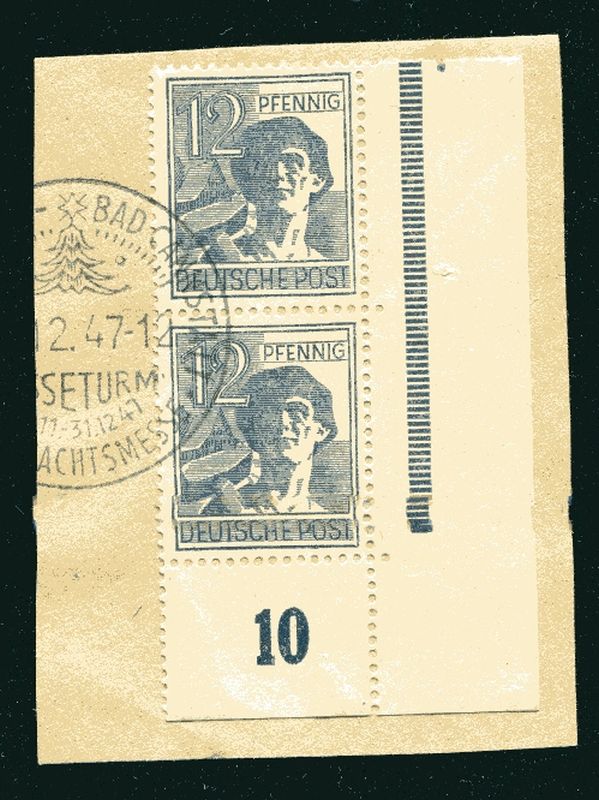 1947 Mi.Nr. 947 , 12 Pfennig Kontrollratsaugabe Bogenecke unten rechts aus Markenheftchenbogen unten durchgezähnt, mit Sonderstempel.