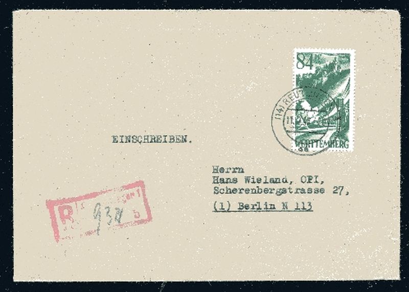 1947 Mi.Nr. 12 , , EF, 84 Pfennig Geschäftsbrief, auf R - Brief, Reutlingen 11.2.48. nach Berlin N 113, mit Ankunftstempel 12.2.48.