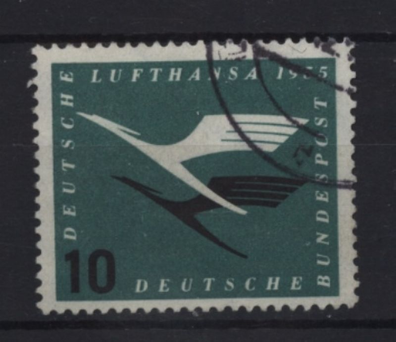1955 Mi.Nr. 206 f41 , 10 Pf. Lufthansa, mit Plattenfehler "U" von DEUTSCHE oben links defekt, wird selten angeboten. Katalog (250.--)Euro.