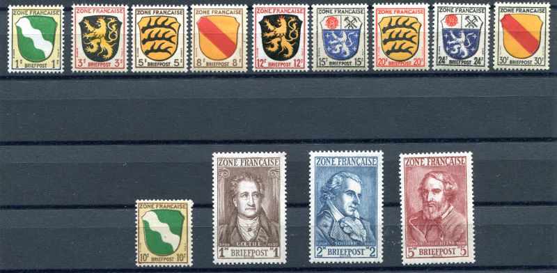 1945 Mi.Nr. 1/13 , französische Zone, kompletter Satz 1 Pfennig bis 5 Mark.