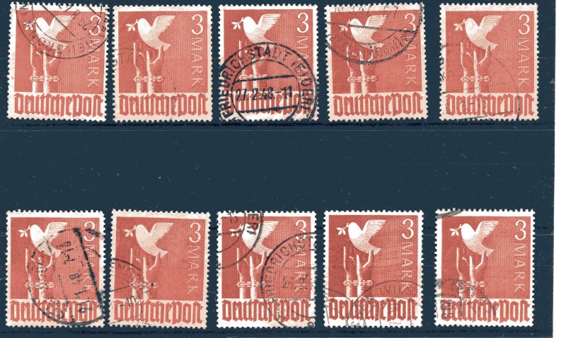 1947 Mi.Nr. 961 , 3 Mark braunrot, 10 Marken alle mit Rundstempel. Mi.(250.--)Euro.