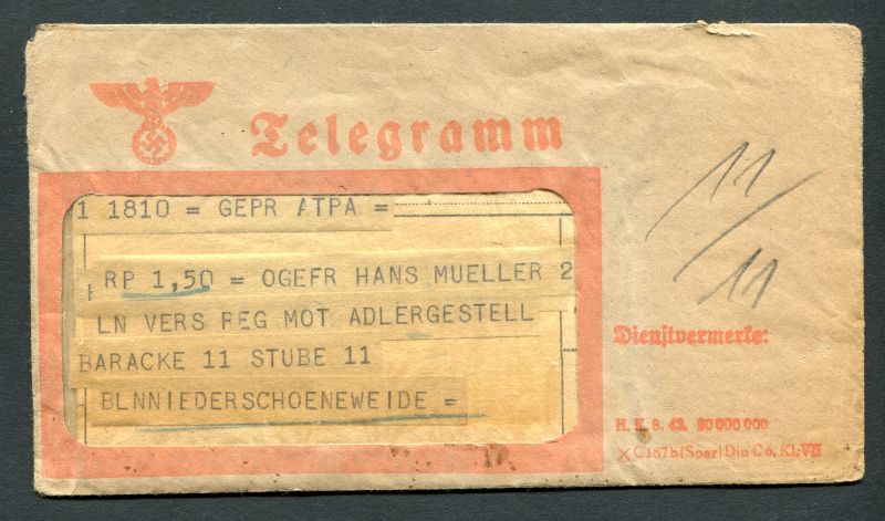 1944 TELEGRAMM Deutsche Reichspost. Haupttelegraphenamt Berlin. "geprüft ATPB (49)" Berlin-Niederschöneweide Bracke 11 Stube 11, im Original Telegramm Umschlag.