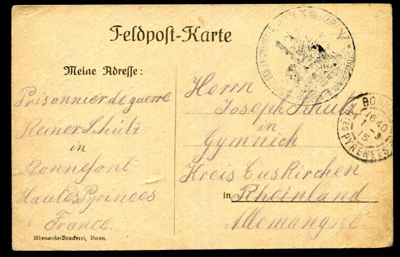 1915 Feldpost-Karte ab Frankreich, Bonngont 1913 nach Gymnich, Kreis Euskirchen.