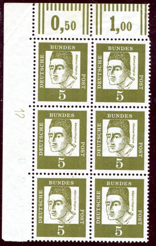 1961 Mi.Nr. 347y , 5 Pfennig Bedeutende Deutsche, mit DZ 12, im 6er Block Bogenecke oben links. Ecke leichter Bug.
