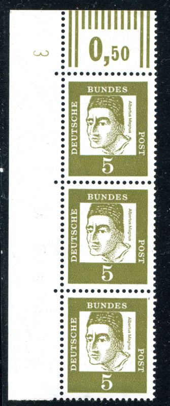 1960 Mi.Nr. 347x 5 Pfennig Bedeutende Deutsche mit DZ 3, senkrechter 3er Streifen mit Bogenrand links.