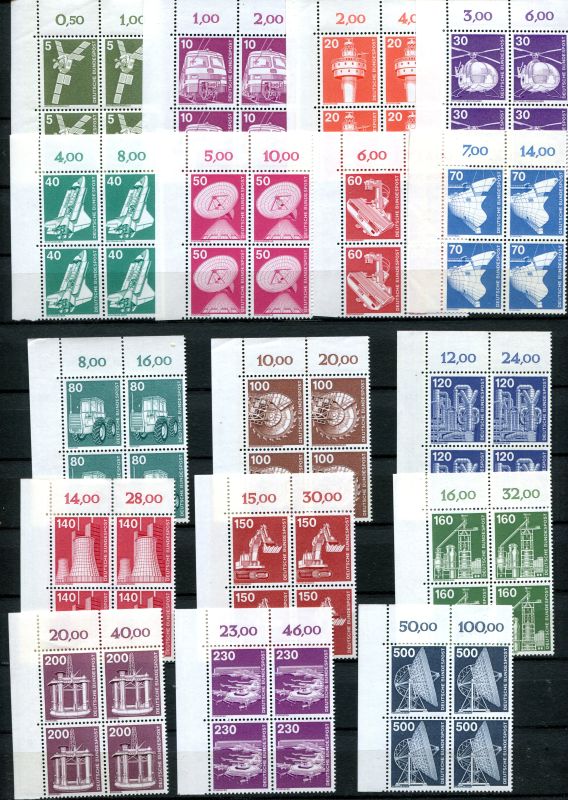 1975 bis 1978 aus Industrie und Technik 17 Werte im , Ty. (A), dabei die Werte 5, 10, 20, 30, 40, 50, 60, 70, 80, 100, 120, 140, 150, 160, 200 230 und 500 Pfennig. Alle Werte einheitlich im Viererblock aus der Bogenecke oben links, in TOP Erhaltung. Selten so angeboten.