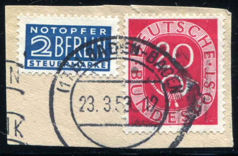 1951 Mi.Nr. 130II , , 20 Pfennig Posthorn auf Briefstück mit Plattenfehler "oberste Schraffe zwischen T und S gebrochen". Im Michel kein Preis.