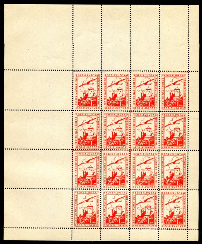 1951 Segelflugpost. Reklamemarke 1 DM. Erster Nachkriegs - Segelflugtag Nürnberg - Fürth. Originalbogen mit 16 Marken, mit allen Seitenrändern. Oben und linke Seite in großer Überbreite. Als Originalbogen sehr selten.