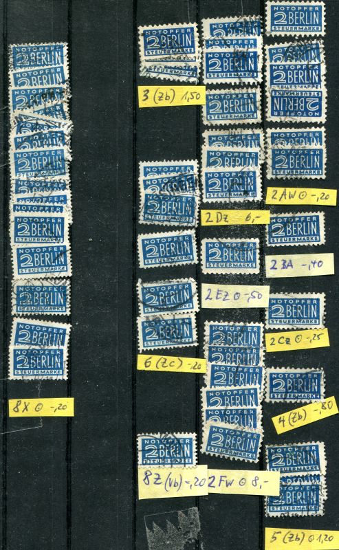 2 Pfennig Notopfer Berlin ca. 50 Marken gezähnt und teils nach Mi. bestimmt, auf einer Steckkarte.