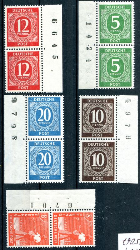 1946 Mi.Nr. 915, 918, 919, 924 , 4 senkrechte Paare, Walzendruck mit Bogenzähler, dabei auch 945 8 Pf. Arbeiter Paar mit Bogenzähler.