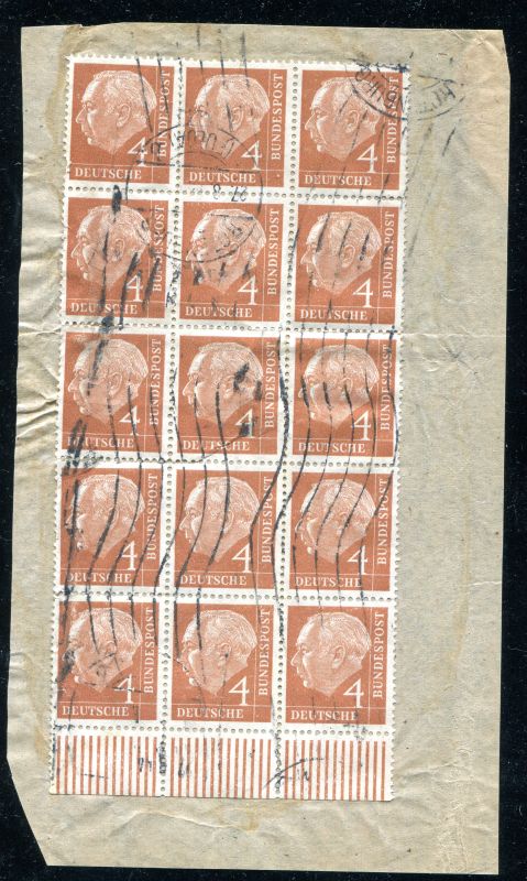 1954 Mi.Nr. 178 , 4 Pfennig Heuss I, im 15er Block auf Briefstück.
