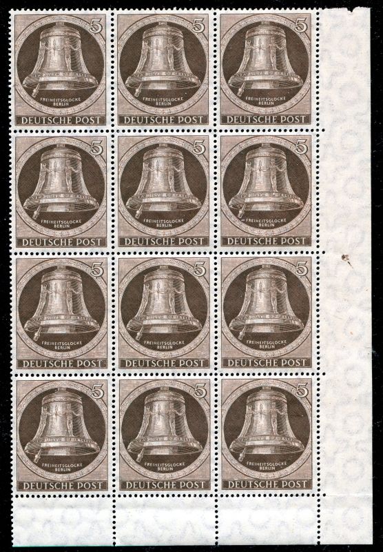 1951 Mi.Nr. 75 , 5 Pfennig 12er Block. Glocke Klöppel links.