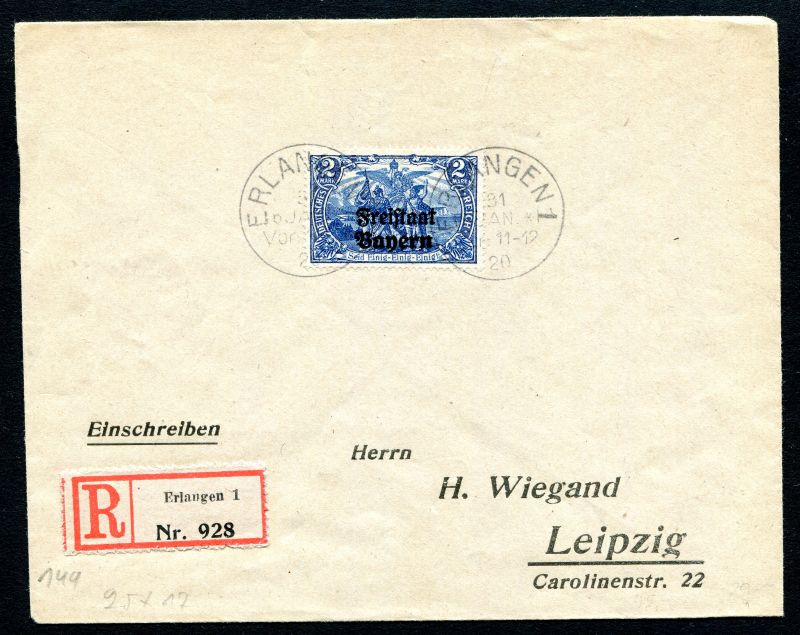 1919 Mi.Nr. 149 B , EF 2 Mark auf R-Brief 25:17 Zahnlöcher, befördert nach Leipzig.