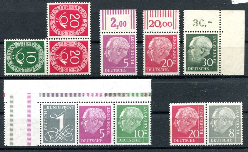 1951 bis 1960 Mi.Nr. 128/258 , aus Posthorn und Heuss Zusammenstellung von 11 Marken teils mit Bogenrand. Mi. ca. 100.00 Euro.