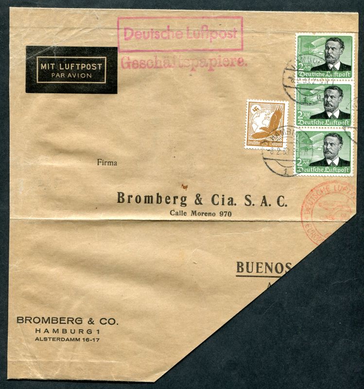 1935 Mi.Nr. 539 senkrechte 3er Streifen 2 RM. und Mi.Nr. 533 auf Luftpostbrief. Rahmenstempel in rot "Deutsche Luftpost" und roter Stempel "Geschäftspapiere". Zusätzlich Luftpoststempel in rot, ab Hamburg.