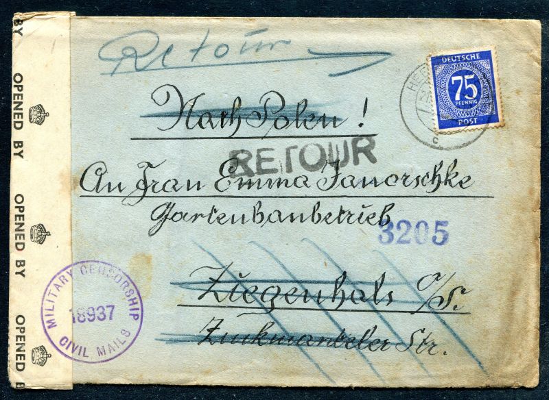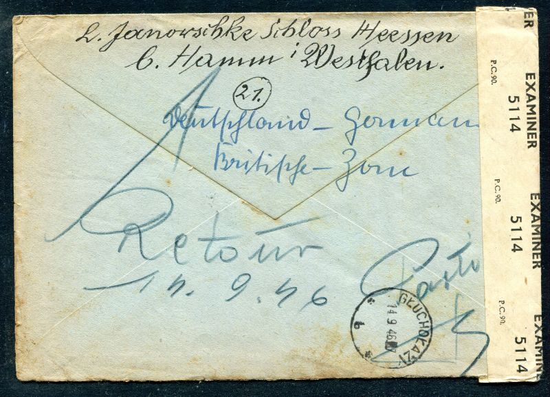 1946 Mi.Nr. 935 , EF auf Zensurbrief, ab Schloss Hessen bei Hamm in Westfalen, befördert nach Polen. (Ziegenhals in Ober-Schlesien, damals "GLUCHOLAZY" dort mit Ankunftstempel 14.9.46 sowie Stempel RETOUR und 2 mal handschriftlich Retour, zurück nach Deutschland.