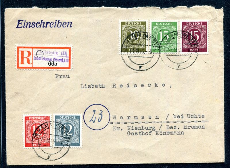 1946 Mi.Nr. 919, 920, 921, 922 und 928 Kontrollratsausgabe Ziffern, auf R-Brief ab Hamm nach (23) Warmsen. (R-Zettel) "Poststelle II Stadt Hamm (Westf.)iR" . Selten.