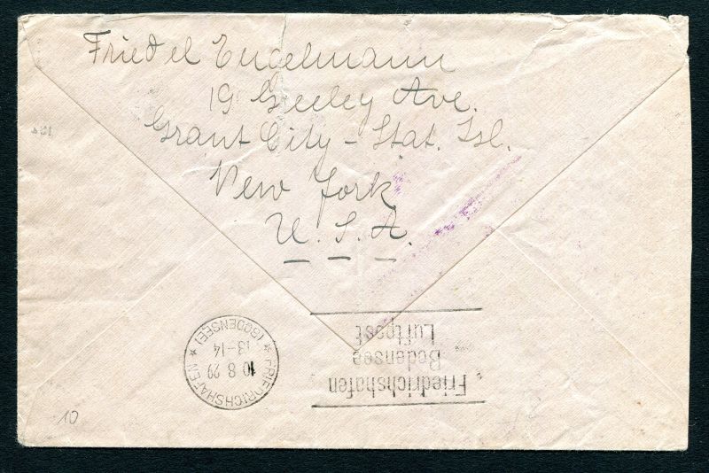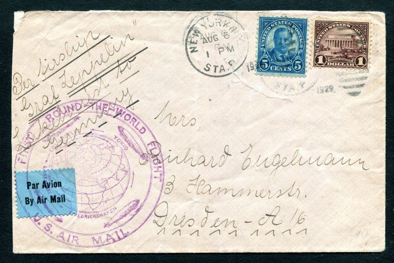 1929 Graf Zeppelin "Weltrundfahrt" mit USA Frankatur, ab 6. August 1929 NEW YORK, mit einen lila Sonderbestätigungsstempel, rückseitiger Ankunftstempel in Friedrichshafen am 10.8.29 befördert nach Dresden.
